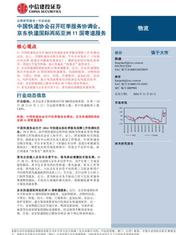 【中信建投证券】【20241103】2024年11月17日更新-【中信建投】物流行业:中国快递协会召开旺季服务协调会,京东快递国际再拓亚洲11国寄递服务-17页