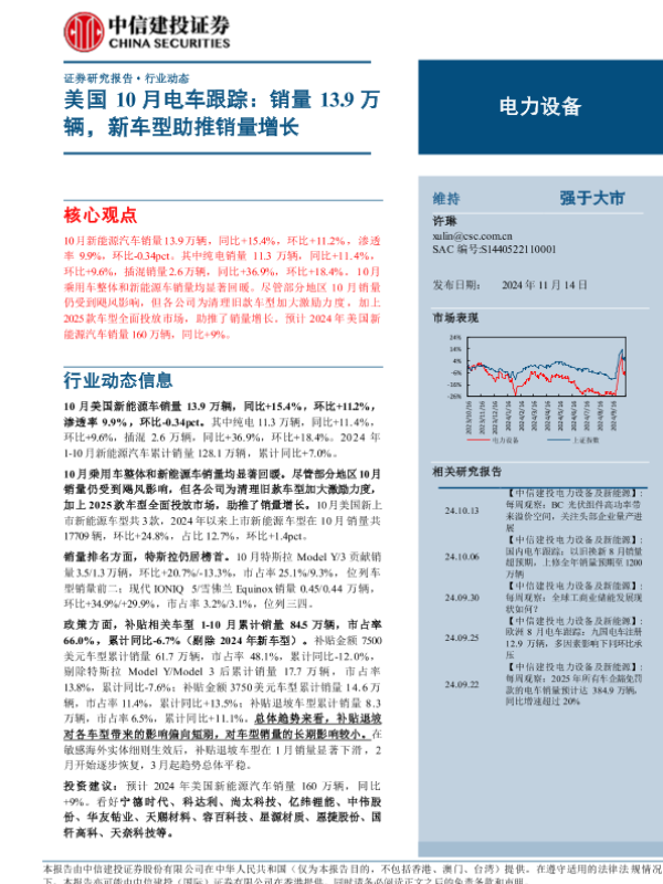 【中信建投证券】【20241114】2024年11月21日更新-【中信建投】电力设备行业美国10月电车跟踪:销量13.9万辆,新车型助推销量增长-13页