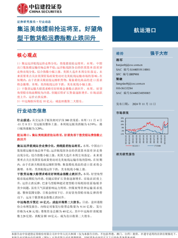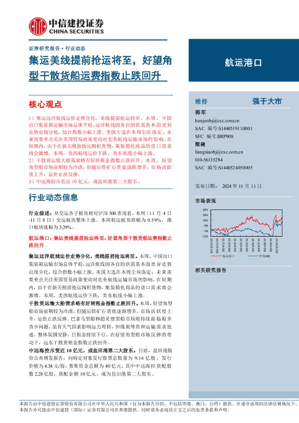 【中信建投证券】【20241111】2024年11月22日更新-【中信建投】航运港口行业:集运美线提前抢运将至,好望角型干散货船运费指数止跌回升-22页