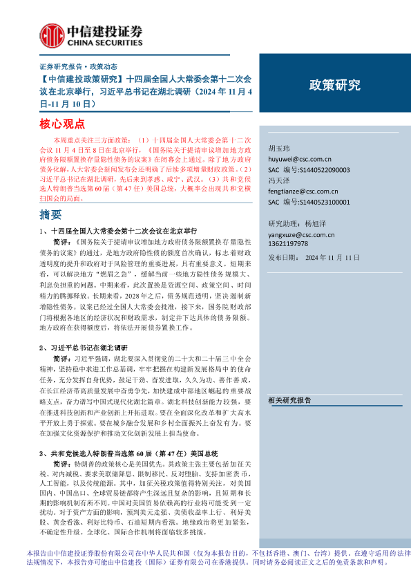 【中信建投证券】【20241125】【中信建投】政策研究-十四届全国人大常委会第十二次会议在北京举行,习近平总书记在湖北调研-15页