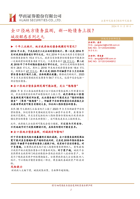 【华西证券】【20241119】城投解惑系列之九:全口径地方债务监测,新一轮债务上报-12页