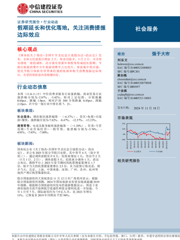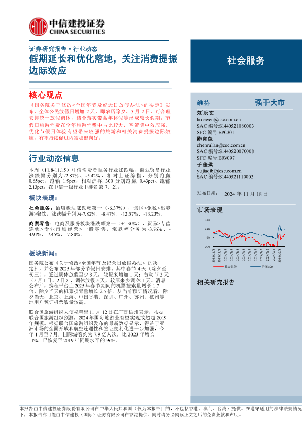 【中信建投证券】【20241118】2024年11月30日更新-【中信建投】社会服务行业动态:假期延长和优化落地,关注消费提振边际效应-27页
