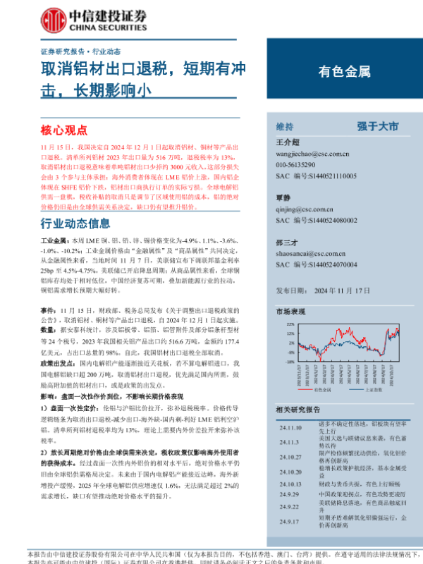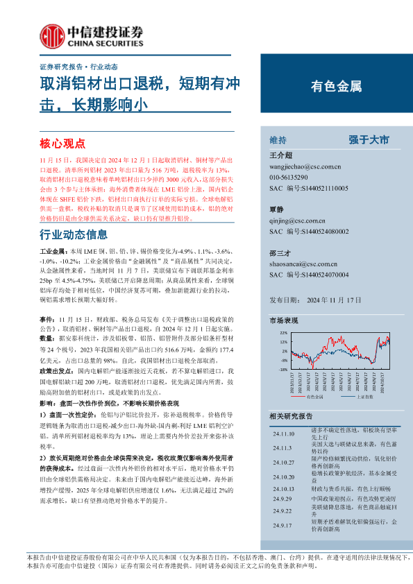 【中信建投证券】【20241117】取消铝材出口退税,短期有冲击,长期影响小-11页