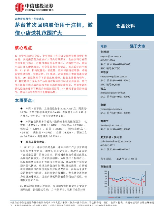 【中信建投证券】【20250105】2025年01月19日更新-【中信建投】食品饮料行业动态:茅台首次回购股份用于注销,微信小店送礼范围扩大-20页