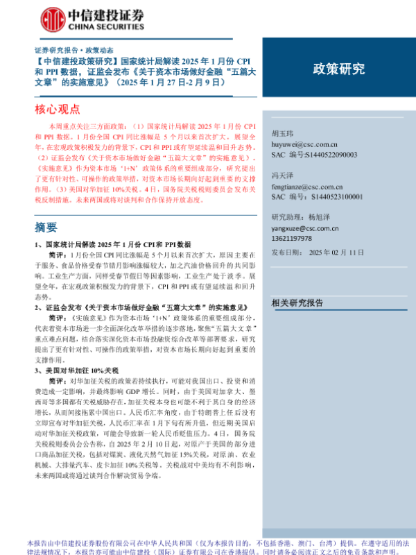 【中信建投证券】【20250211】国家统计局解读2025年1月份CPI和PPI数据,证监会发布《关于资本市场做好金融“五篇大文章”的实施意见》-15页