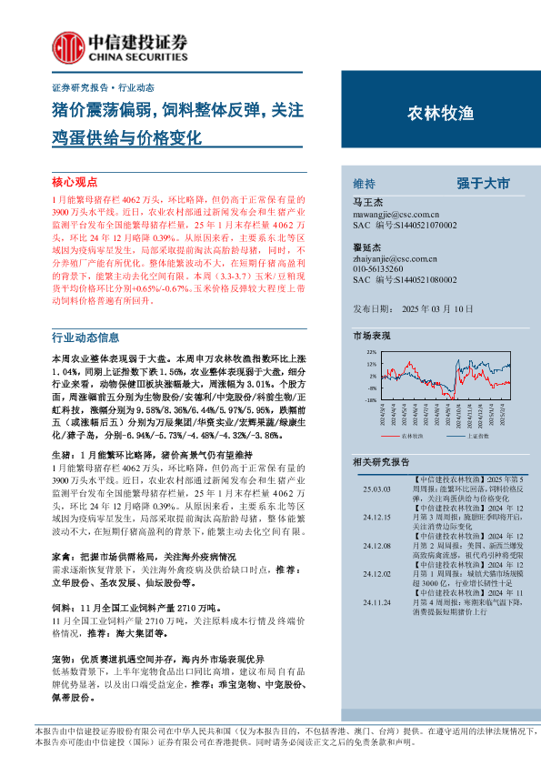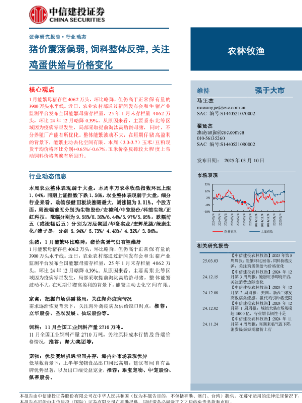 【中信建投证券】【20250310】2025年03月22日更新-【中信建投】农林牧渔行业:猪价震荡偏弱,饲料整体反弹,关注鸡蛋供给与价格变化-14页