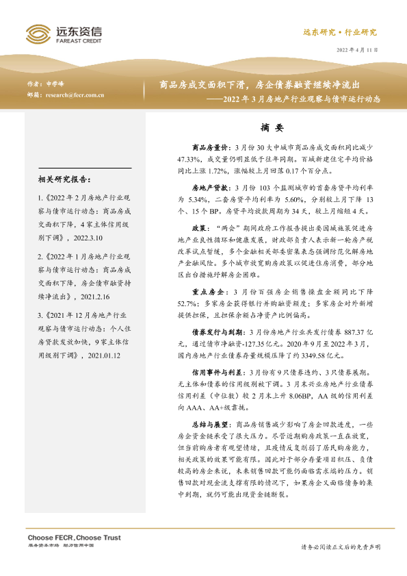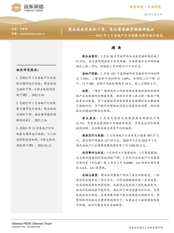 【远东资信】【20220411】2022年3月房地产行业观察与债市运行动态:商品房成交面积下滑,房企债券融资继续净流出-19页