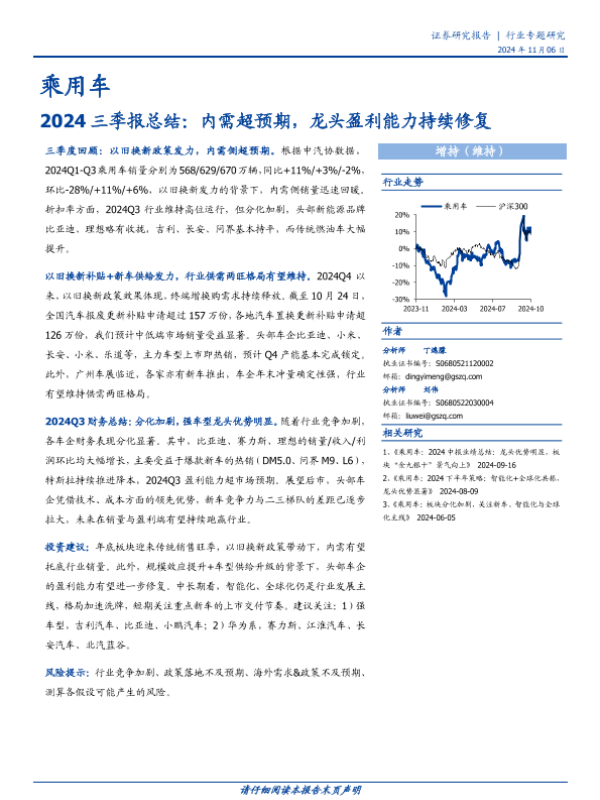 【国盛证券】【20241113】乘用车行业2024三季报总结:内需超预期,龙头盈利能力持续修复-10页