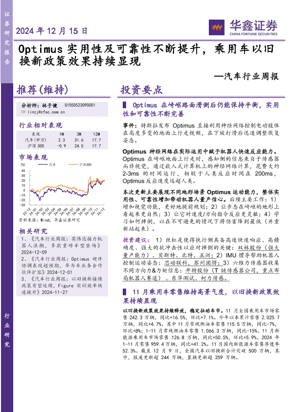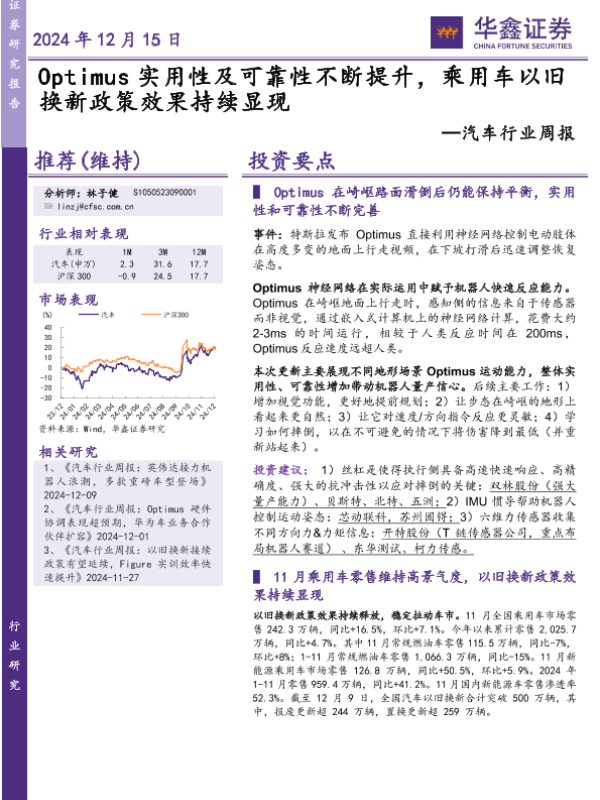 【华鑫证券】【20250116】2025年01月16日更新-【华鑫证券】汽车行业周报:Optimus实用性及可靠性不断提升,乘用车以旧换新政策效果持续显现-17页