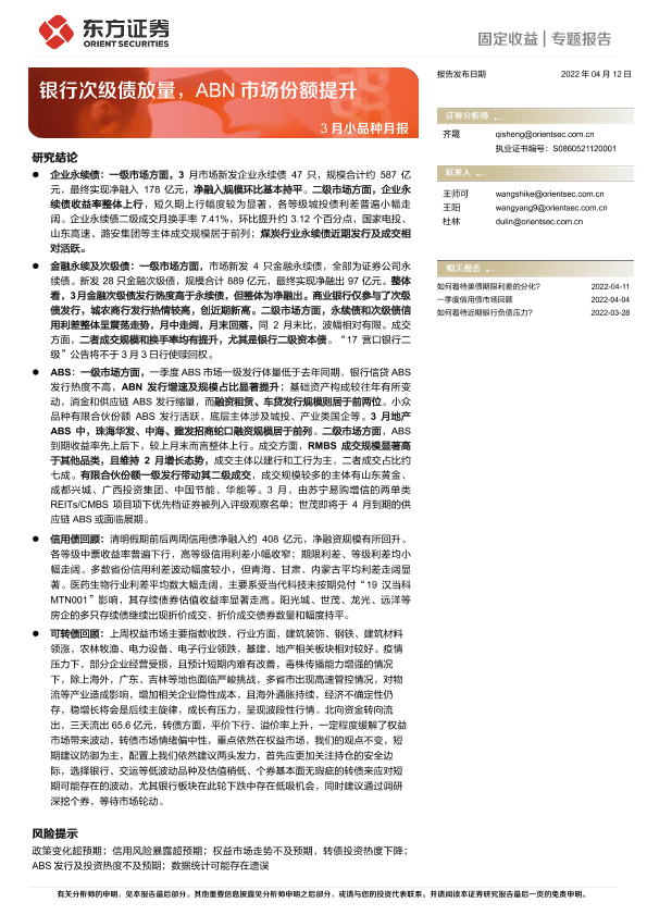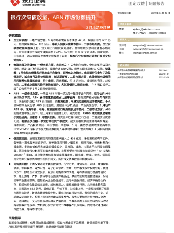 【东方证券】【20220412】3月小品种月报:银行次级债放量,ABN市场份额提升-26页
