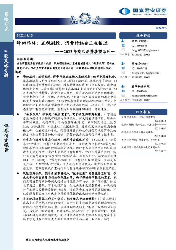 【国泰君安证券】【20220415】峰回路转:正视荆棘,消费的机会正在临近——2022年疫后消费展望系列一-22页