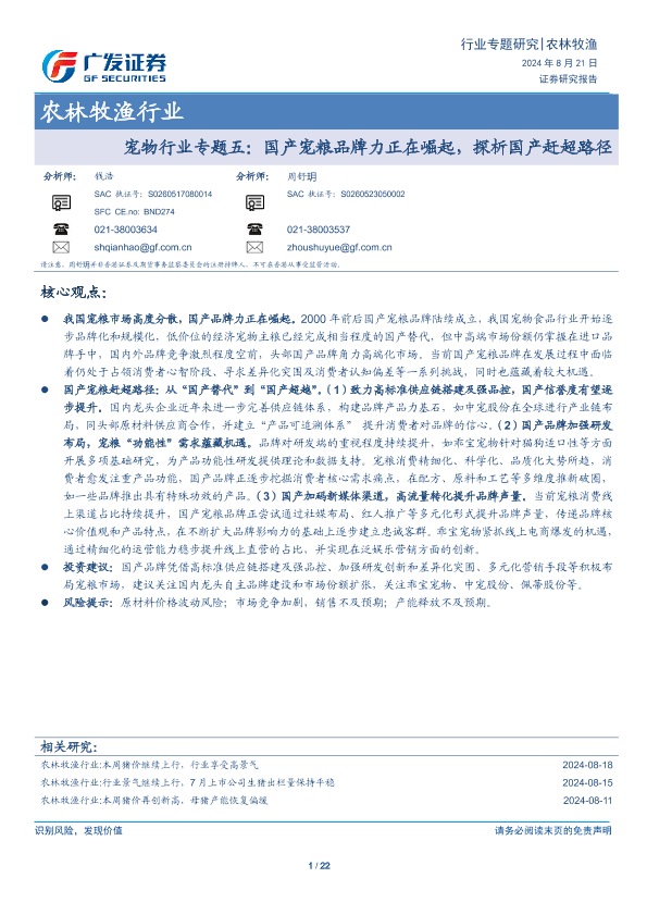 【广发证券】【20240821】2024年08月22日更新-农林牧渔行业:宠物行业专题五国产宠粮品牌力正在崛起探析国产赶超路径-22页