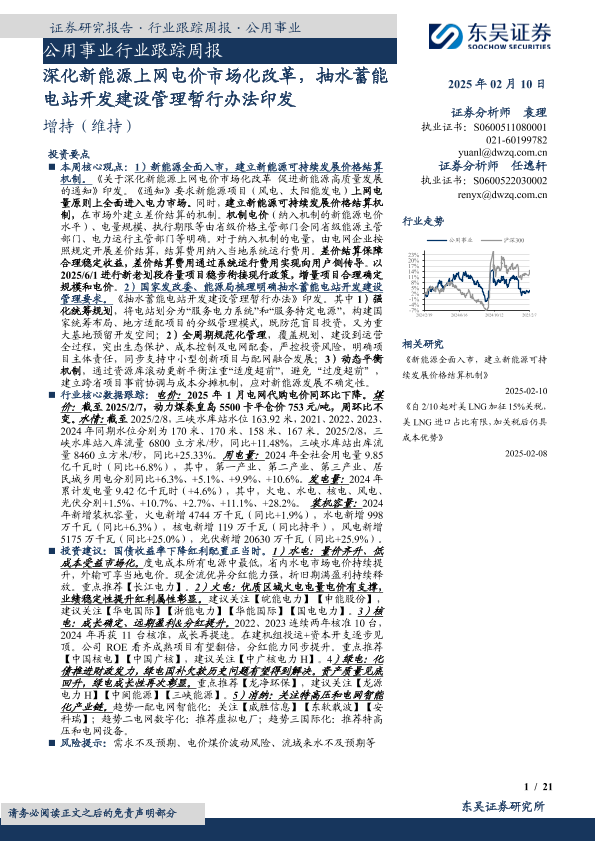 【东吴证券】【20250214】2025年02月14日更新-【东吴证券】公用事业行业跟踪周报:深化新能源上网电价市场化改革,抽水蓄能电站开发建设管理暂行办法印发-21页