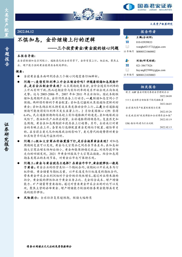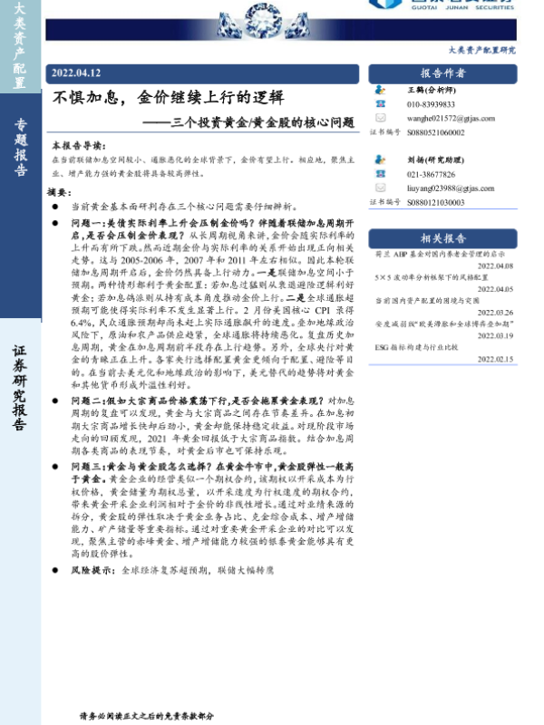 【国泰君安证券】【20220412】不惧加息,金价继续上行的逻辑——三个投资黄金/黄金股的核心问题-22页