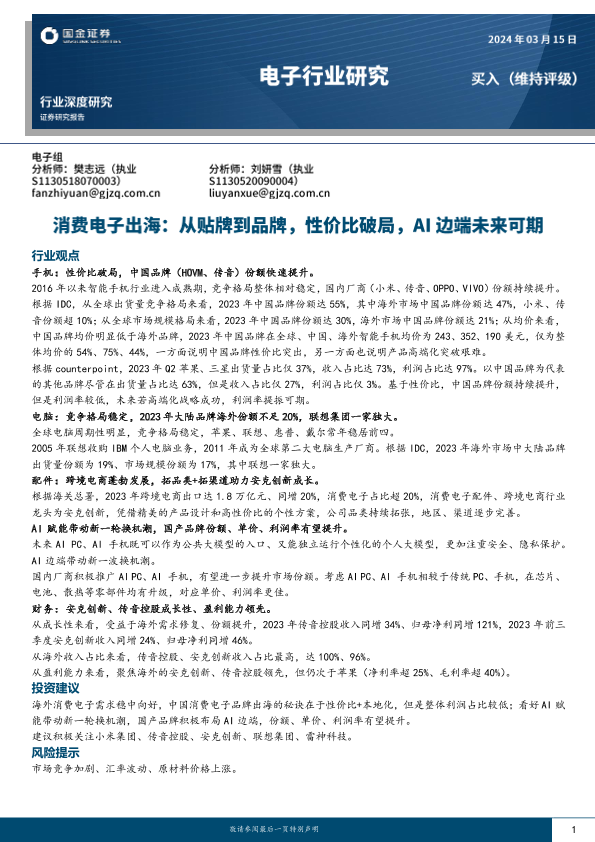 【国金证券】【20240316】2024年03月16日更新-【国金证券】电子行业研究-消费电子出海-从贴牌到品牌-性价比破局-AI边端未来可期-23页