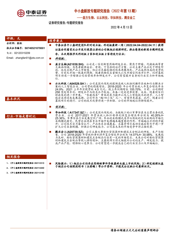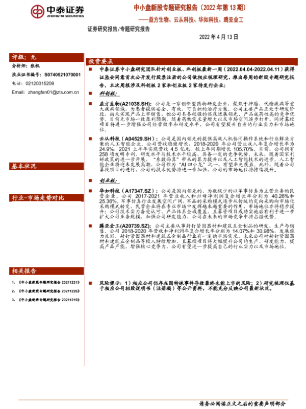 【中泰证券】【20220413】中小盘新股专题研究报告(2022年第13期):益方生物、云从科技、华如科技、腾亚金工-20页