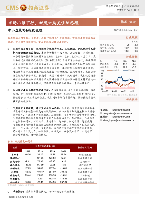 【海通证券】【20220412】中小盘策略&新股梳理:市场小幅下行,新股申购关注纳芯微-19页