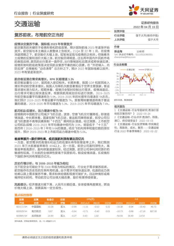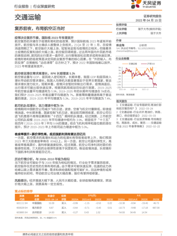 【天风证券】【20220415】交通运输行业深度研究:复苏前夜,布局航空正当时-23页