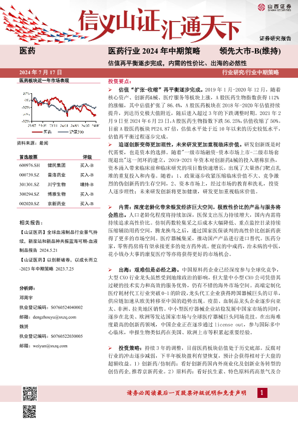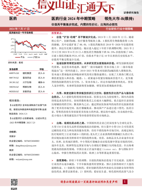 【山西证券】【20240813】医药行业2024年中期策略:估值再平衡逐步完成,内需的性价比、出海的必然性-32页