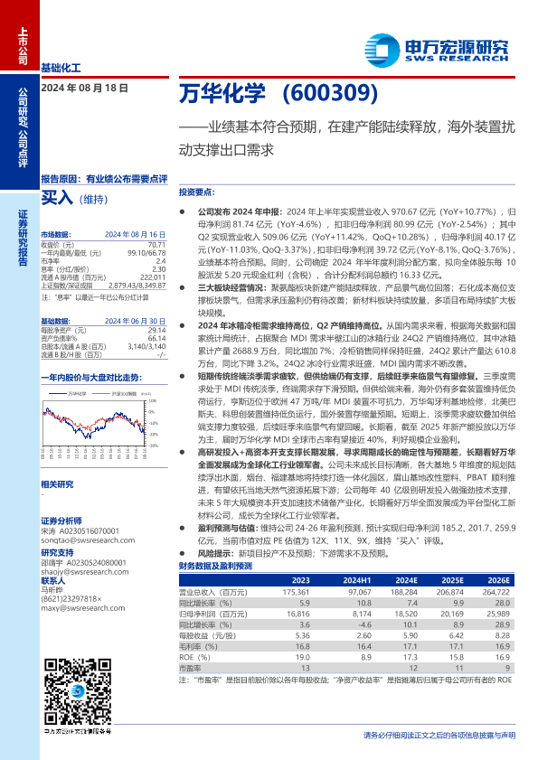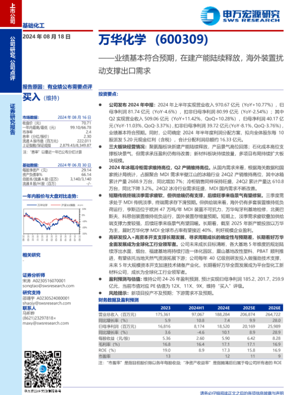 【申万宏源】【20240818】2024年08月31日更新-万华化学(600309)业绩基本符合预期,在建产能陆续释放,海外装置扰动支撑出口需求-10页