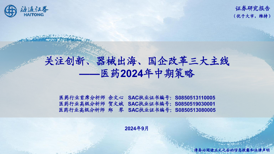 【海通证券】【202409】医药行业2024年中期策略:关注创新、器械出海、国企改革三大主线-24页