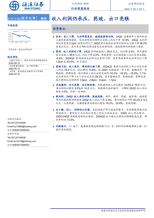 【海通证券】【20240905】2024年09月06日更新-建材行业深度报告:收入利润仍承压药玻、出口亮眼-19页