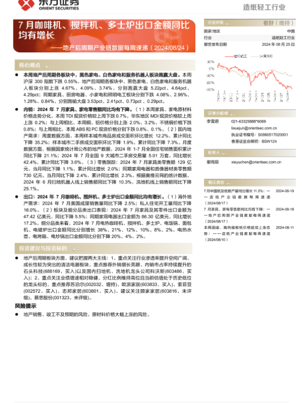 【东方证券】【20240825】2024年09月09日更新-【东方证券】造纸轻工行业地产后周期产业链数据每周速递:7月咖啡机、搅拌机、多士炉出口金额同比均有增长-15页