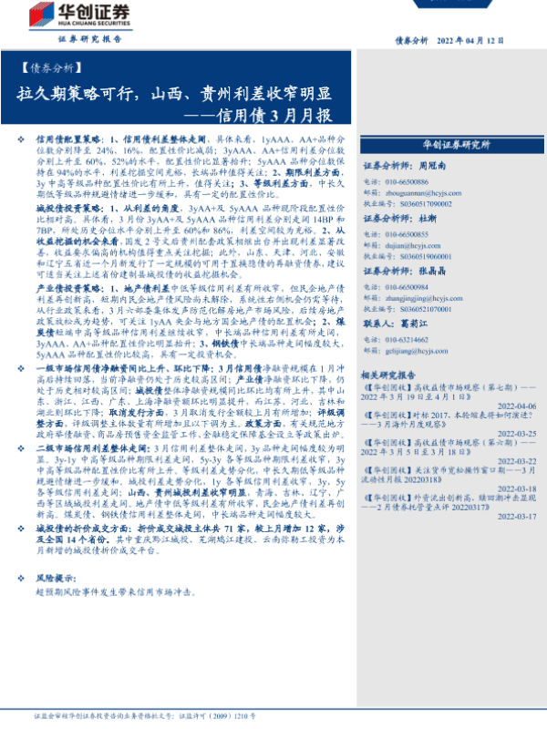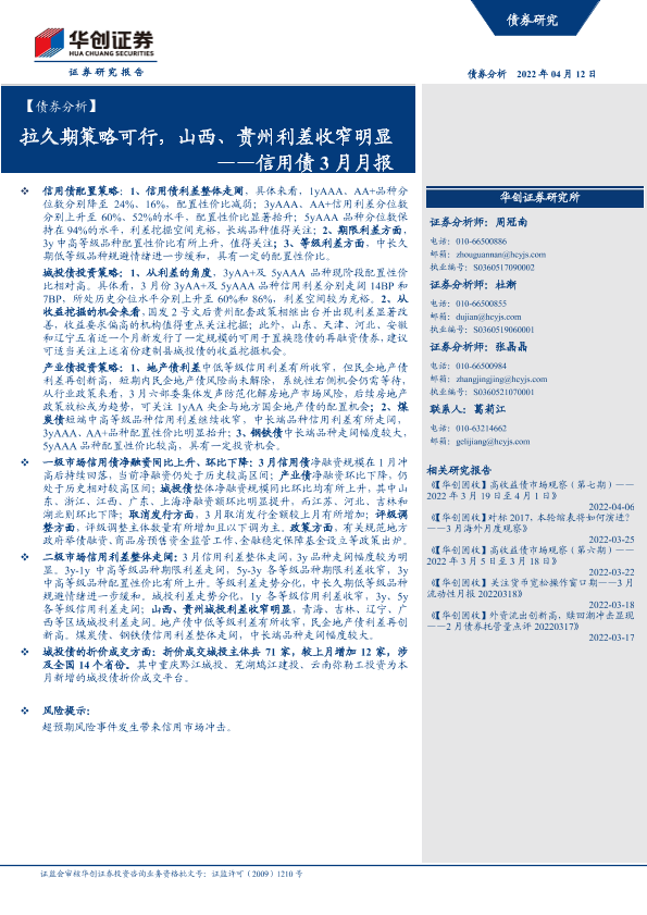 【华创证券】【20220412】信用债3月月报:拉久期策略可行,山西、贵州利差收窄明显-23页