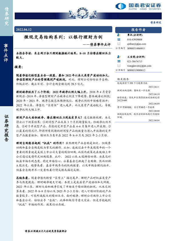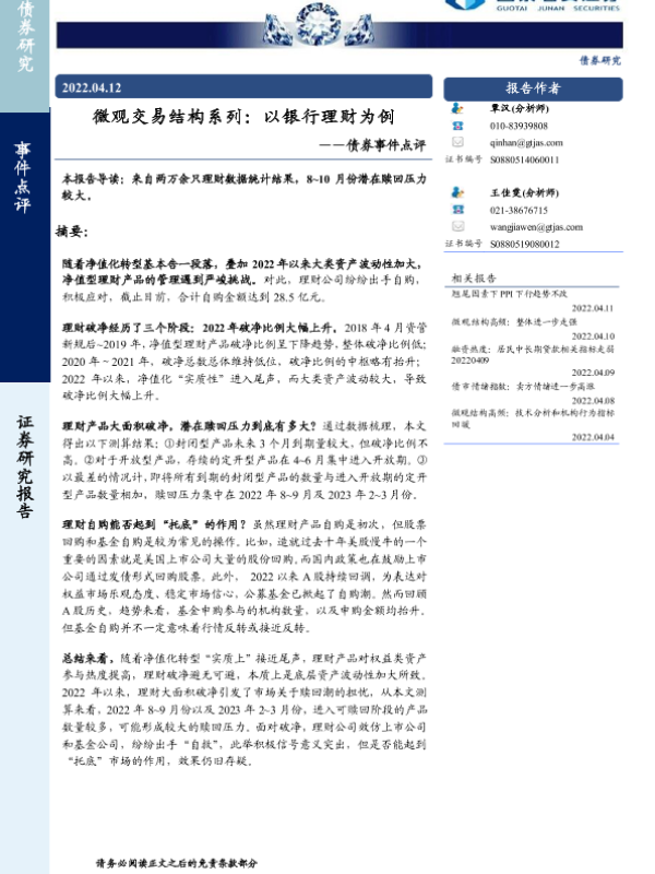 【国泰君安证券】【20220412】微观交易结构系列:以银行理财为例——债券事件点评-15页