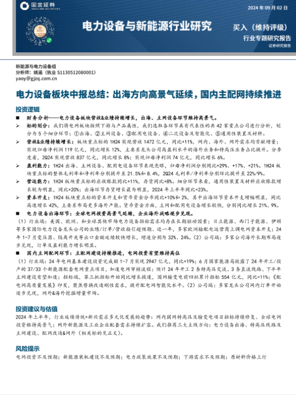 【国金证券】【20240902】电力设备与新能源行业研究-电力设备板块中报总结:出海方向高景气延续,国内主配网持续推进-17页