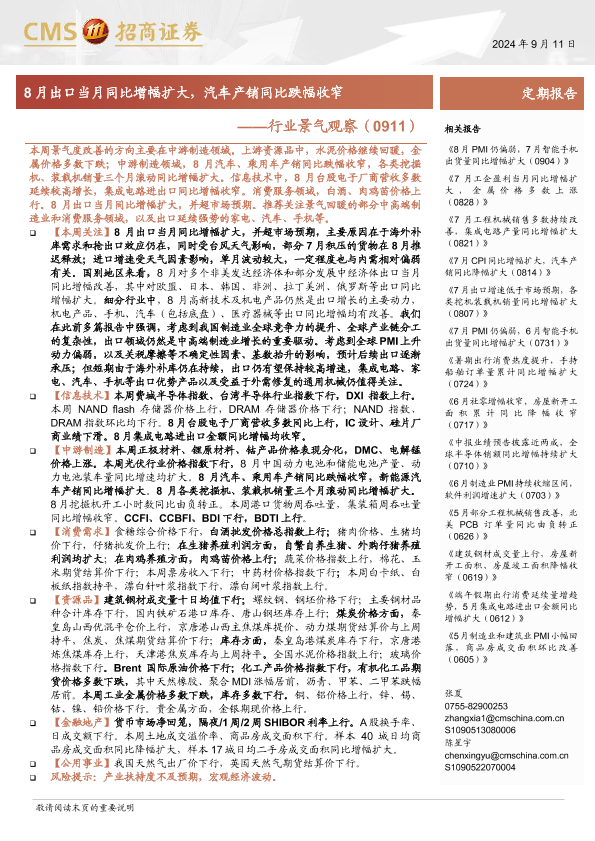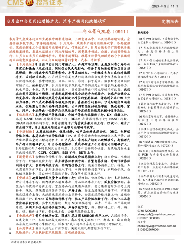 【海通证券】【20240922】2024年09月22日更新-【招商证券】行业景气观察(0911):8月出口当月同比增幅扩大,汽车产销同比跌幅收窄-35页
