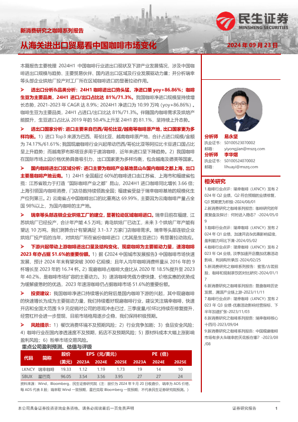 【民生证券】【20240923】2024年09月25日更新-新消费研究之咖啡系列报告:从海关进出口贸易看中国咖啡市场变化-23页