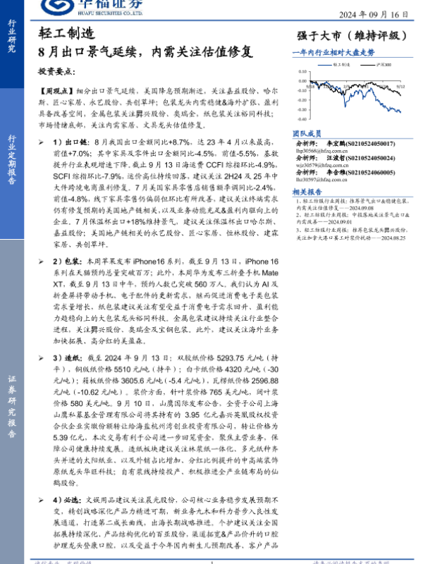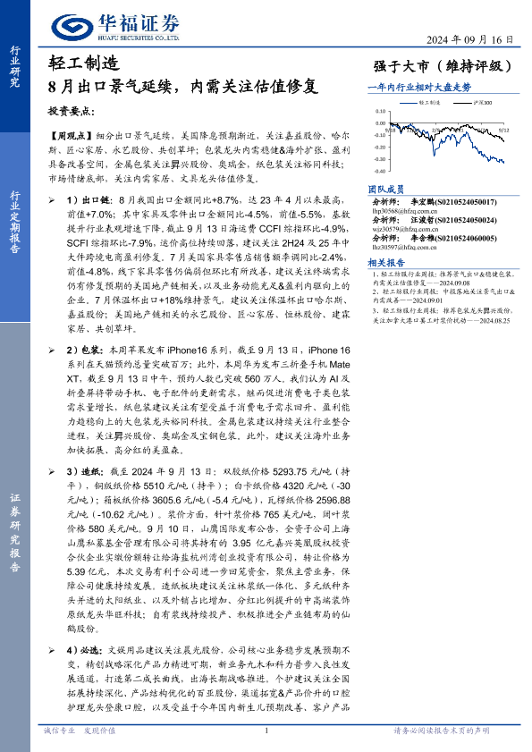 【华福证券】【20240916】2024年09月28日更新-【华福证券】轻工制造行业定期报告:8月出口景气延续,内需关注估值修复-21页