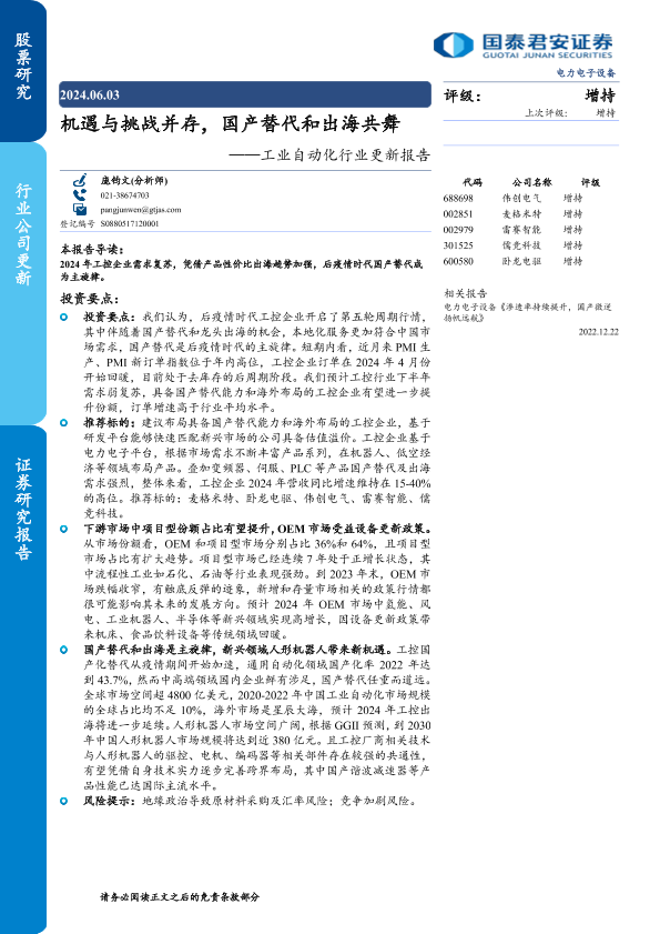 【国泰君安证券】【20241004】2024年10月04日更新-【国泰君安】工业自动化行业更新报告:机遇与挑战并存 国产替代和出海共舞-40页