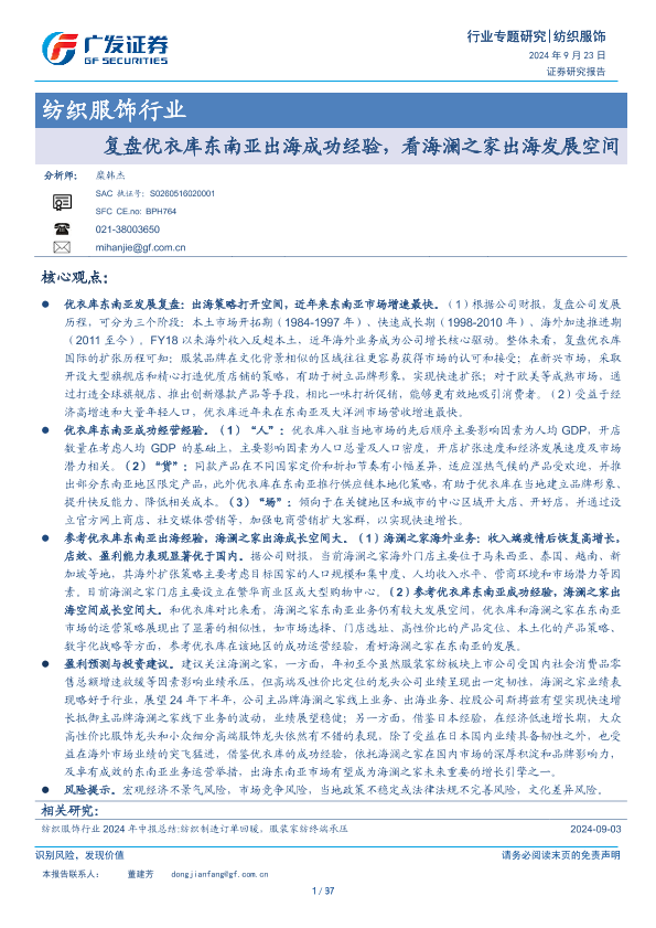 【广发证券】【20241008】纺织服饰行业:复盘优衣库东南亚出海成功经验,看海澜之家出海发展空间-37页