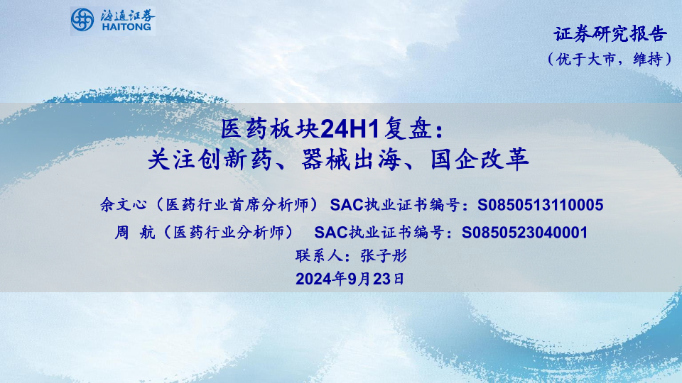 【海通证券】【20241013】医药行业板块24H1复盘:关注创新药、器械出海、国企改革-13页