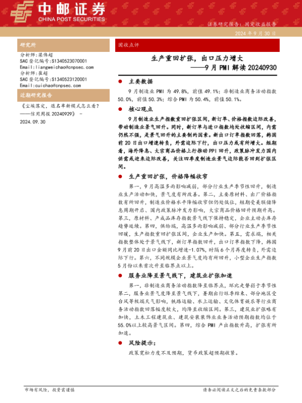 【中邮证券】【20240930】2024年10月15日更新-【中邮证券】9月PMI解读:生产重回扩张,出口压力增大-11页