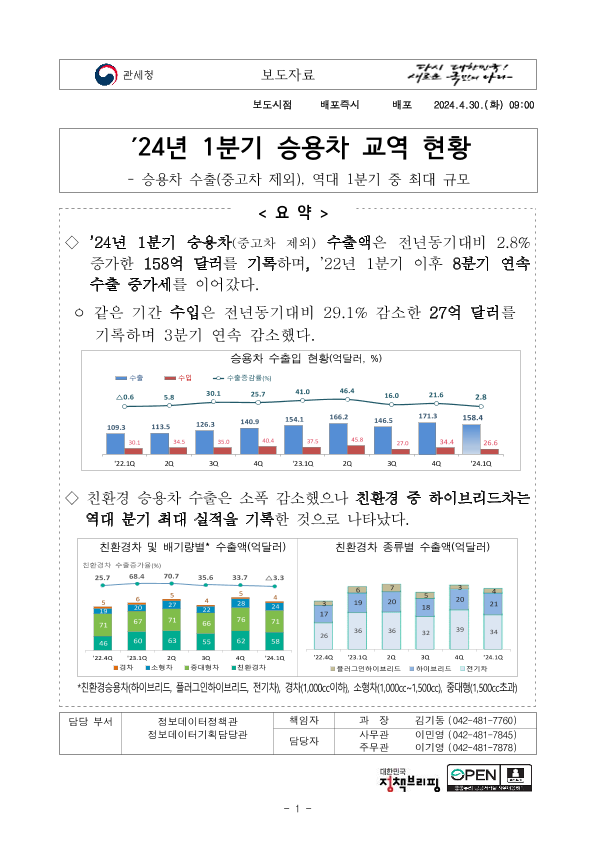 【韩国关税厅】【20240430】2024年第一季度韩国汽车行业进出口数据-14页
