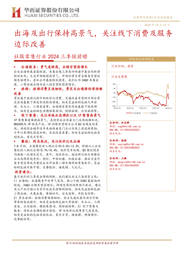 【华西证券】【20241026】社服零售行业2024三季报前瞻:出海及出行保持高景气,关注线下消费及服务边际改善-10页