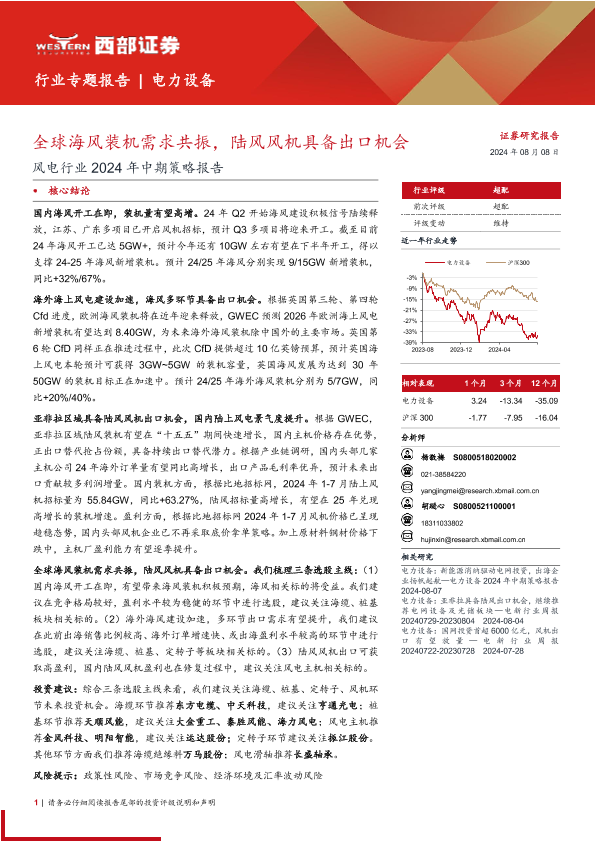 【西部证券】【20240808】风电行业2024年中期策略报告:全球海风装机需求共振陆风风机具备出口机会-30页