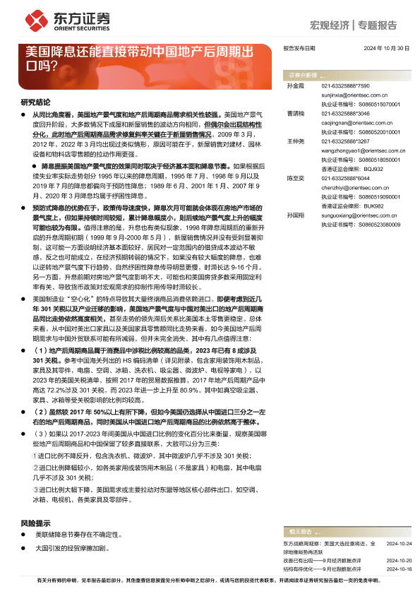 【东方证券】【20241030】2024年11月07日更新-【东方证券】宏观经济专题报告:美国降息还能直接带动中国地产后周期出口吗-13页