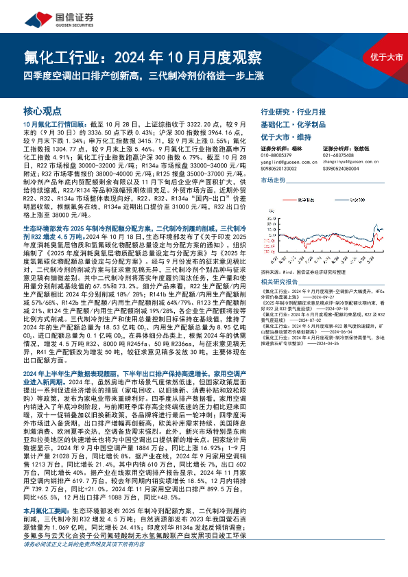 【国信证券】【20241107】氟化工行业2024年10月月度观察:四季度空调出口排产创新高,三代制冷剂价格进一步上涨-27页