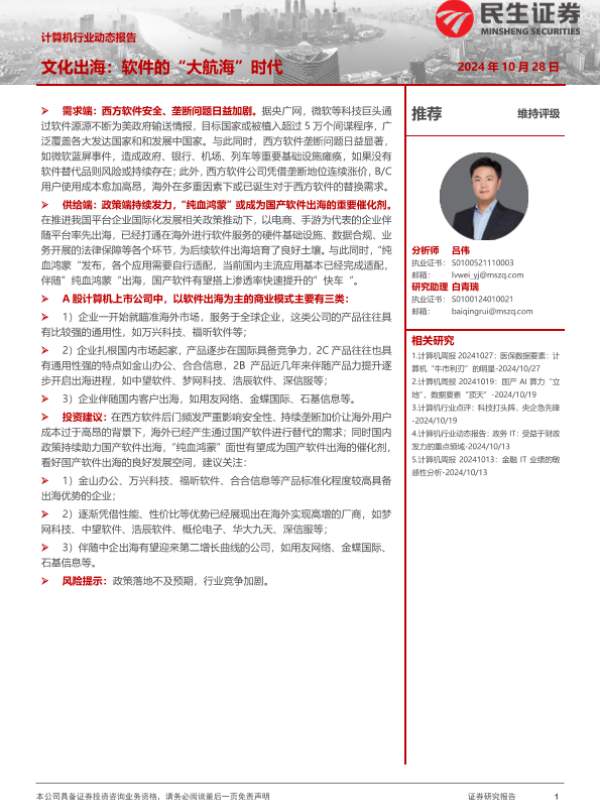 【民生证券】【20241108】计算机行业动态报告:文化出海,软件的“大航海”时代-15页