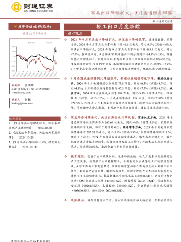 【财通证券】【20241109】轻工行业出口月度跟踪:家具出口降幅扩大,9月美通胀再回落-17页