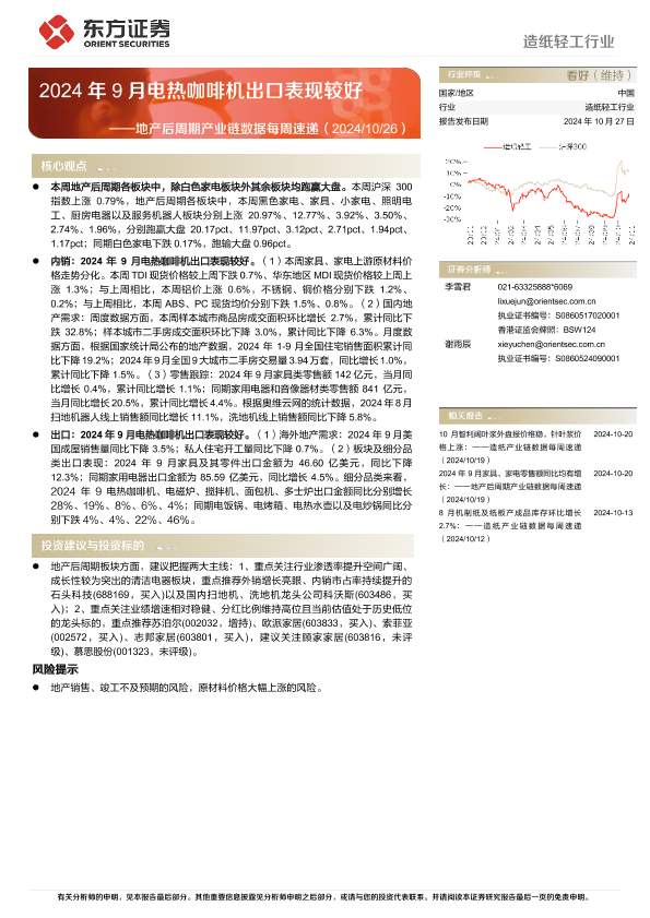 【东方证券】【20241027】2024年11月11日更新-【东方证券】造纸轻工行业地产后周期产业链数据每周速递:2024年9月电热咖啡机出口表现较好-15页