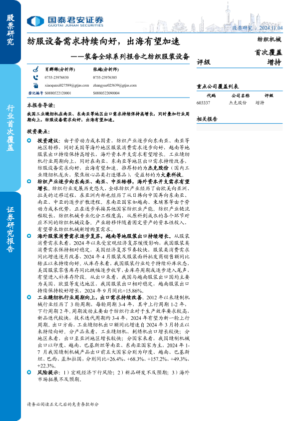 【国泰君安证券】【20241114】纺织机械行业装备全球系列报告之纺织服装设备:纺服设备需求持续向好,出海有望加速-25页