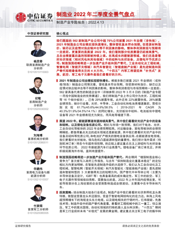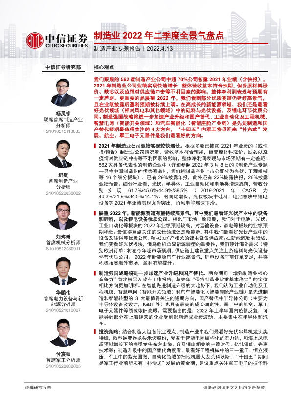 【中信证券】【20220413】制造行业:制造产业专题报告,制造业2022年二季度全景气盘点-46页