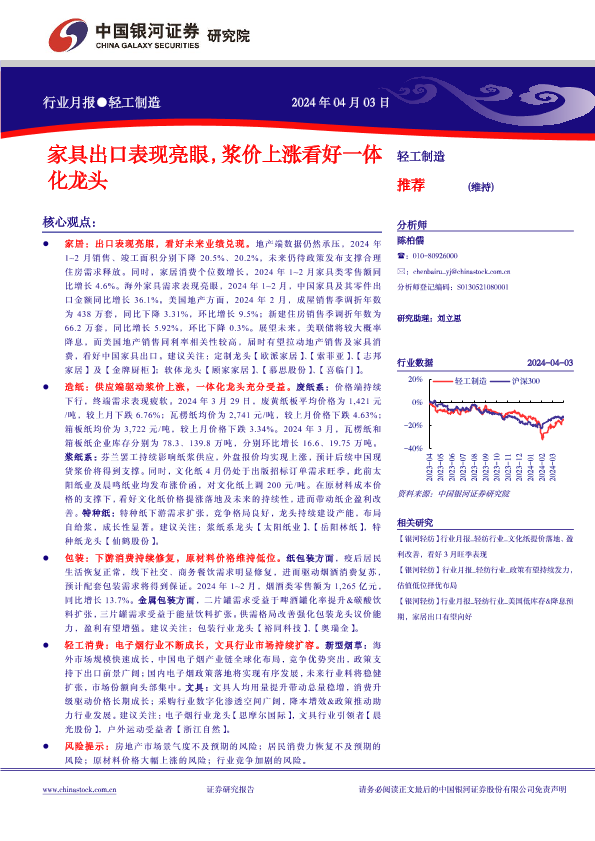 【银河证券】【20241114】2024年11月14日更新-【中国银河证券】轻工制造行业月报:家具出口表现亮眼,浆价上涨看好一体化龙头-19页