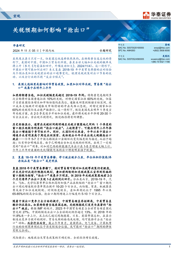 【华泰证券】【20241105】2024年11月15日更新-【华泰证券】宏观专题研究:关税预期如何影响“抢出口”-14页