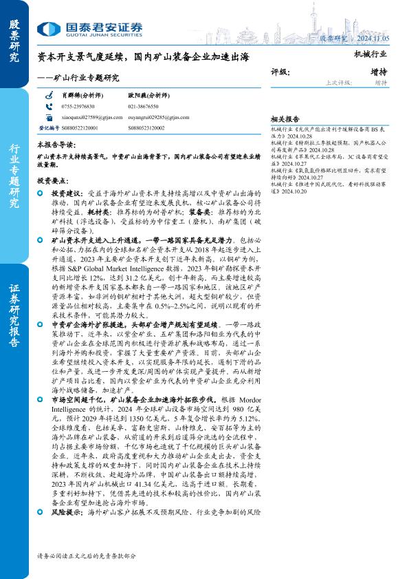 【国泰君安证券】【20241105】2024年11月16日更新-【国泰君安】矿山行业专题研究:资本开支景气度延续,国内矿山装备企业加速出海-36页